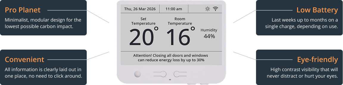 We have designed the Nudge EMS Thermostat screen to be comfortably read yet gentle on the eye. Electronic Paper (e-paper) is a versatile technology due to its ability to work for a very long time on minimal power. It’s also very vision-friendly for users of varying abilities under changing lighting conditions.